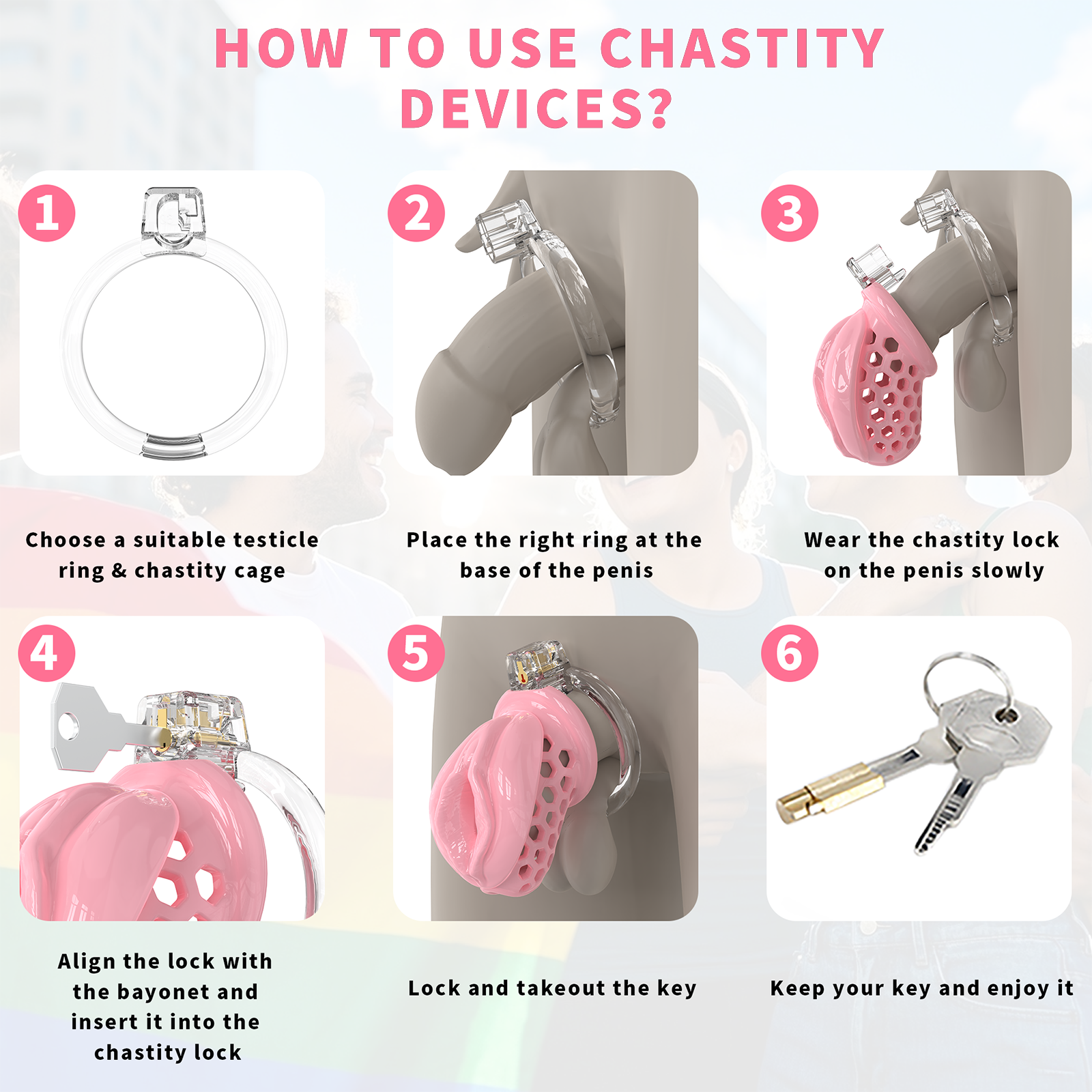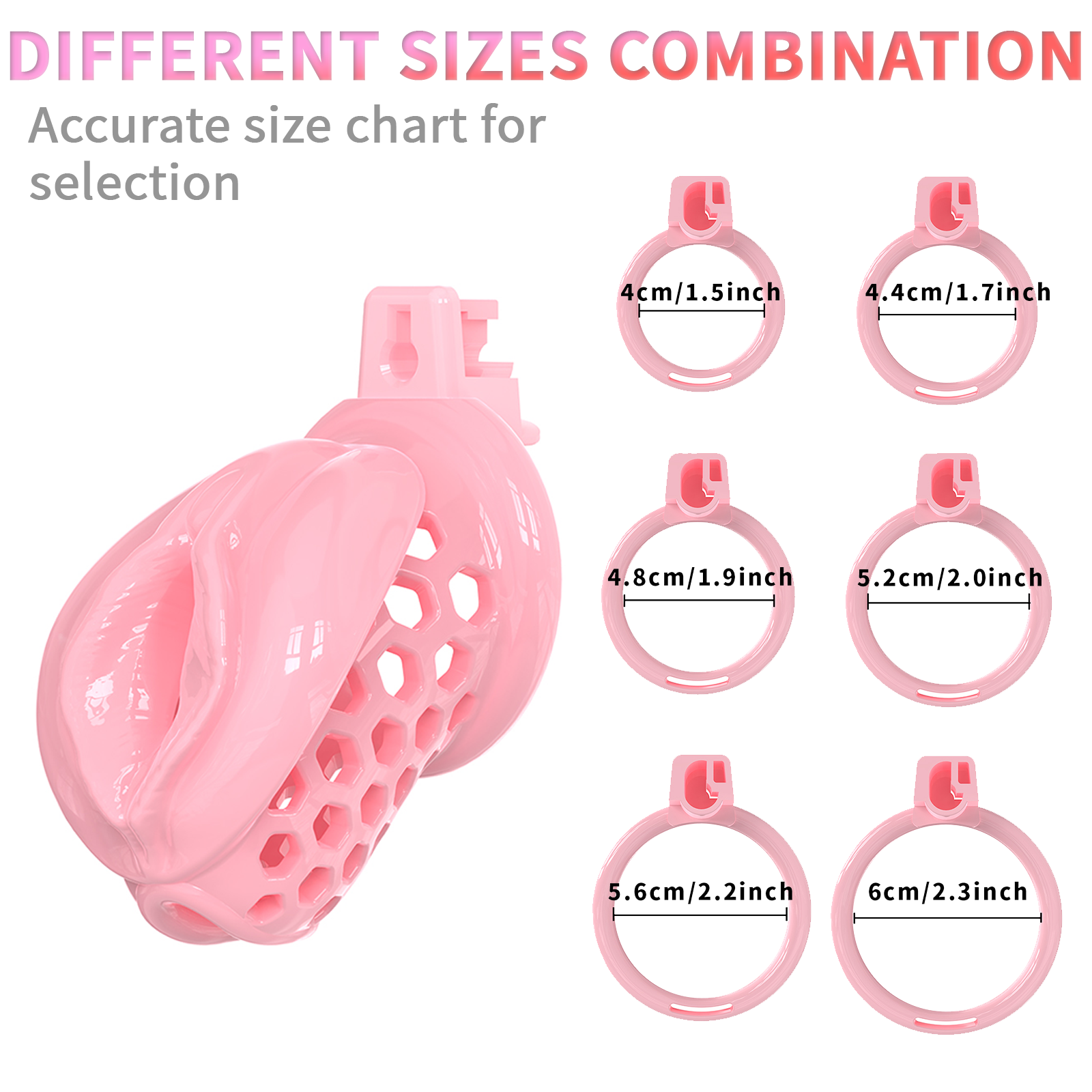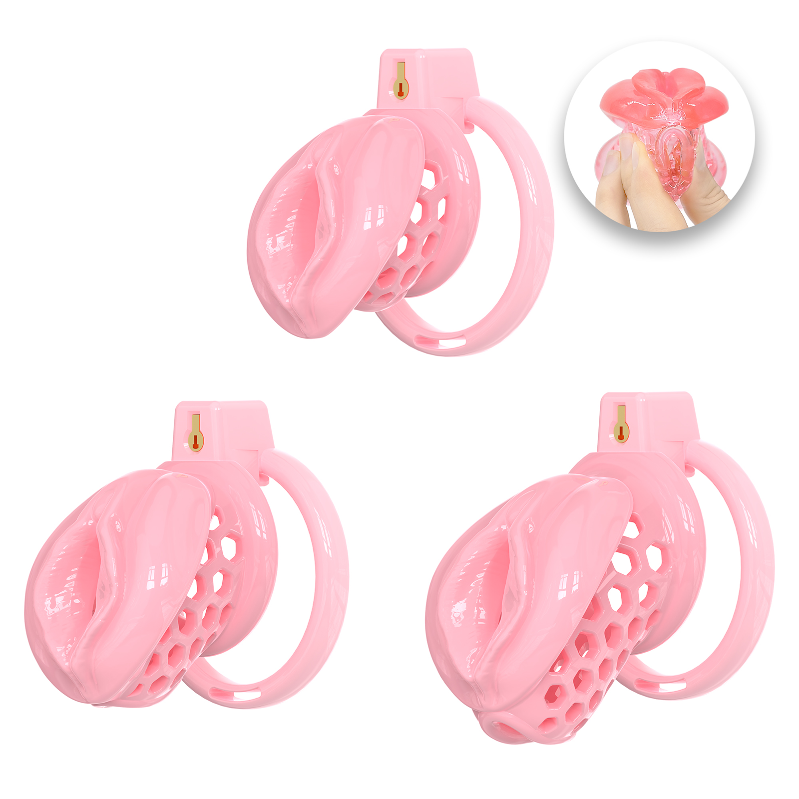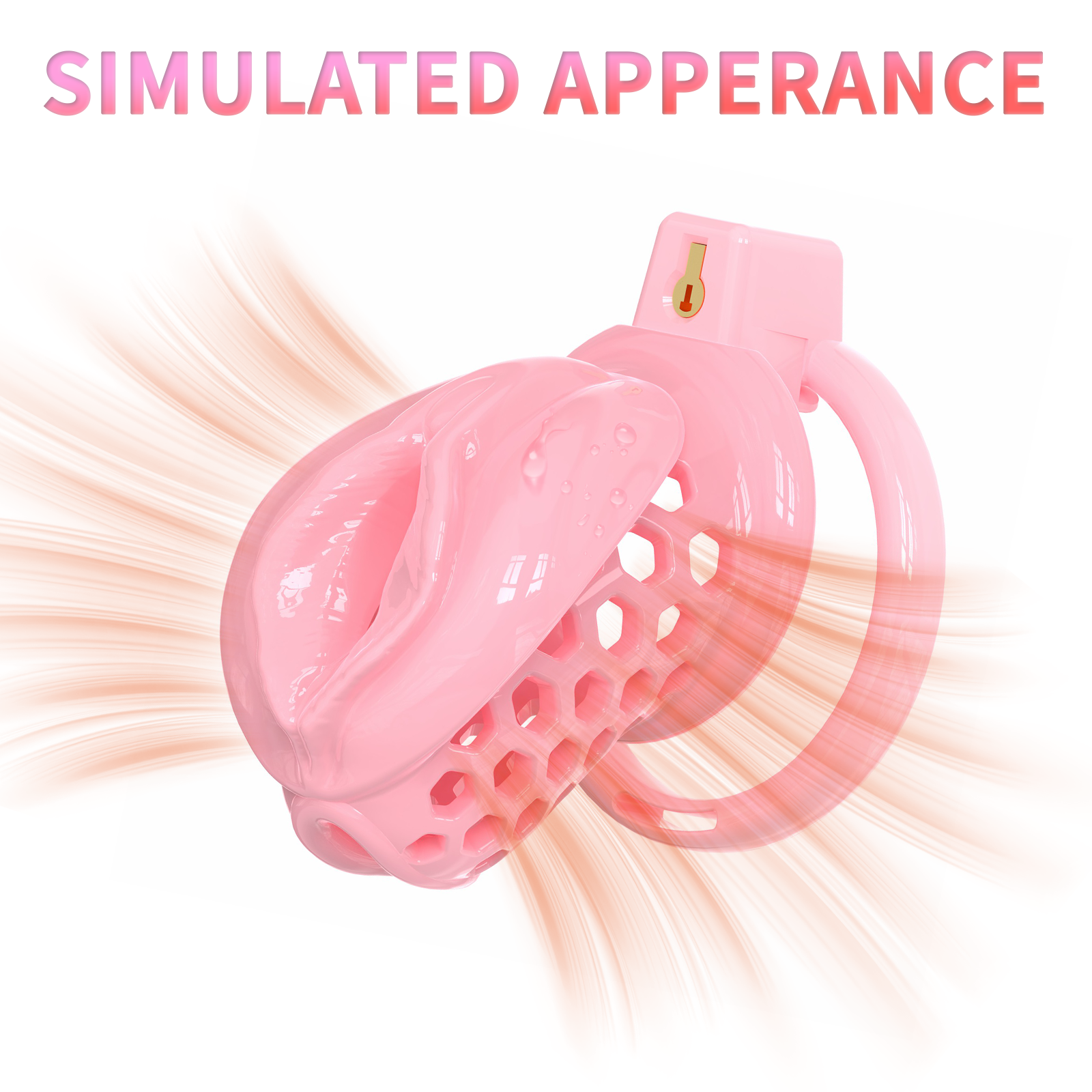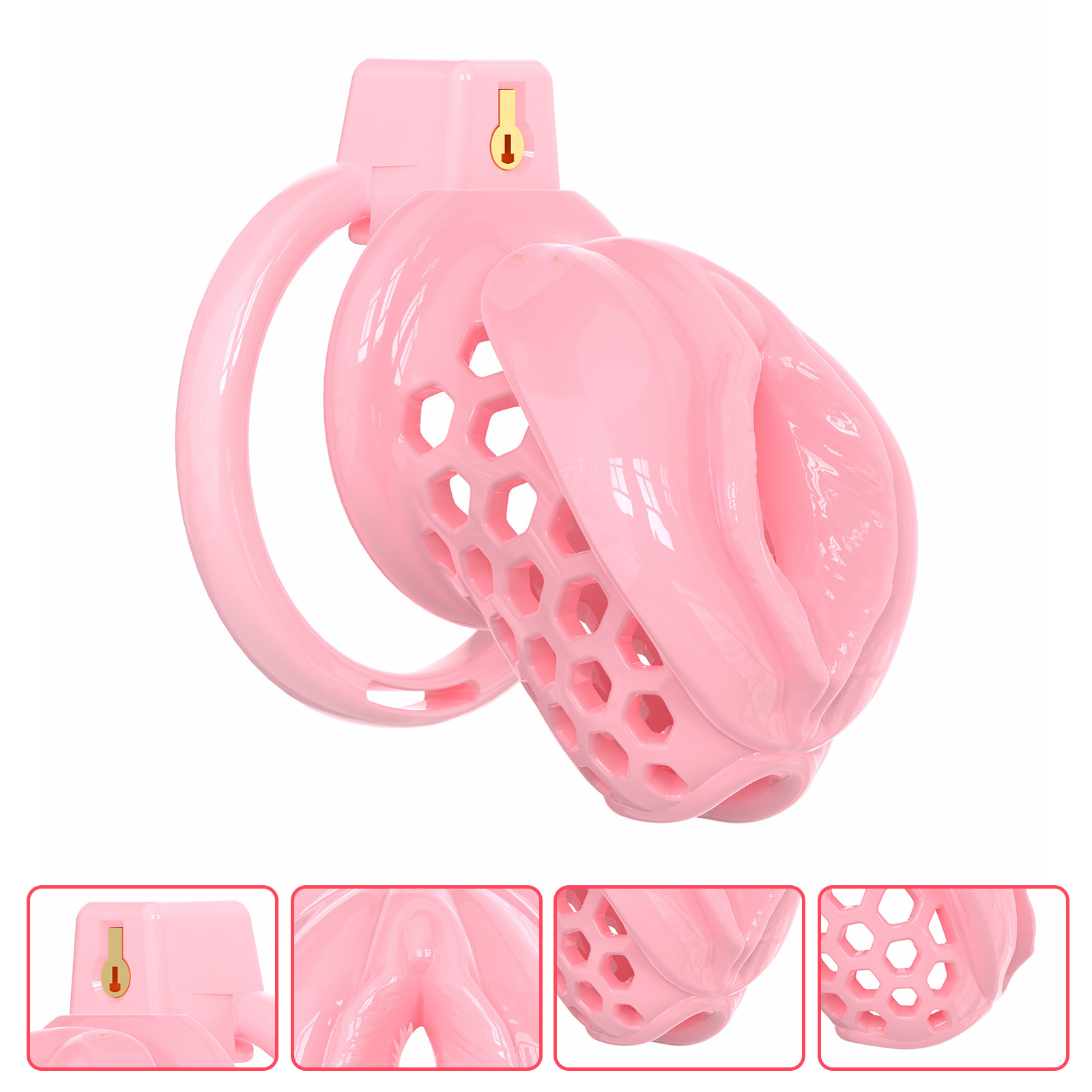 Enjoy playful control with this pink male chastity cage, soft TPE covered, realistic labia and comfortable breathable design.