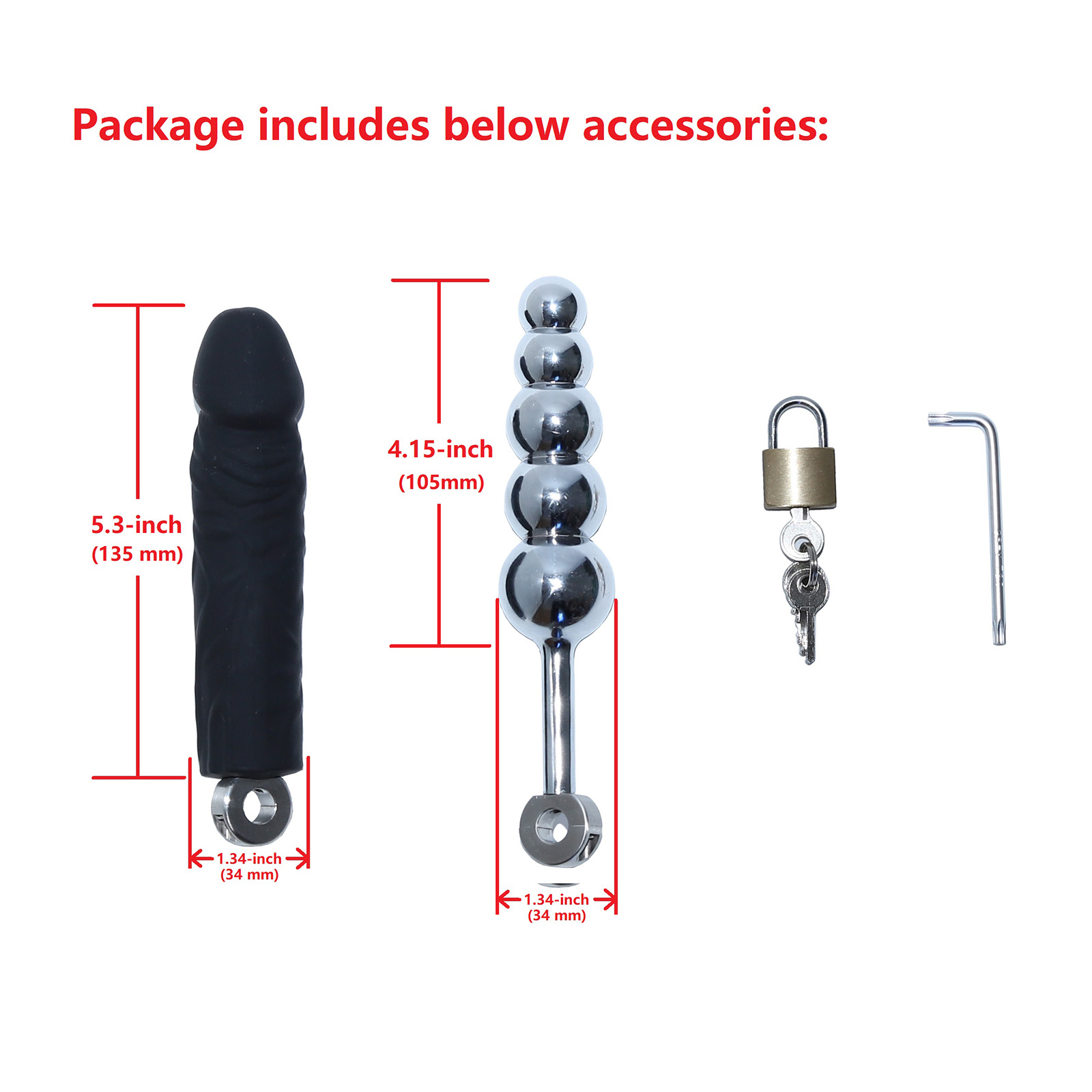 【多种配件】每套包含一个可替换的假阳具、一个304不锈钢肛塞、一个排便孔和一个锁,为不同的偏好和束缚程度提供多样化的选择和便利。